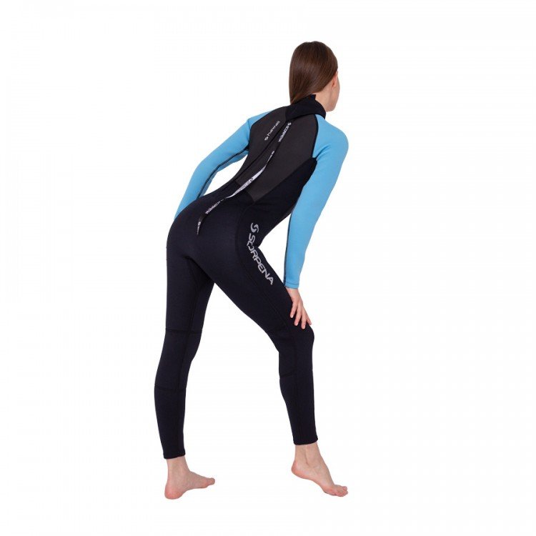 The lower front and back parts of the wetsuit and knee panels are made of thicker 3mm neoprene and are protected by a textile coating on both sides. The sides of the wetsuit, sleeves, collar, pants below the knees and crotch are made of thinner 2mm neoprene for greater elasticity to make the suit more tightly fit the figure and keep warm without restricting movement.